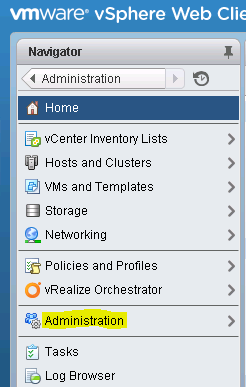 - Login to vCenter Web client and on home screen, navigate to Administration section from navigation menu as highlighted in below screenshot.
