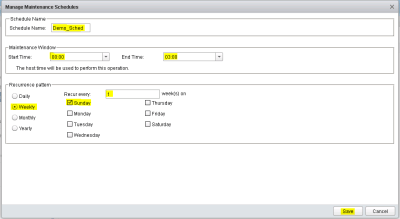 - Enter a name that describes the maintenance schedule. Select a time of day when maintenance can begin.Select a time of day when maintenance must stop.Select the repeatable pattern of days when maintenance occurs, within the times already specified.