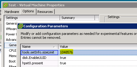 The configuration file (.vmx) containing the informational name-value pairs is limited to 1MB by default.