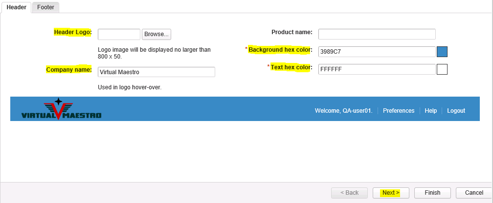 - Under Header tab, upload the logo image by clicking browse button. Also you can enter additional details like company name, product name and modify color scheme appearance by changing hex color codes and click next.