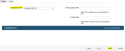 - On footer tab, enter details like copyright year, privacy policy and contacts link and click on finish Button.