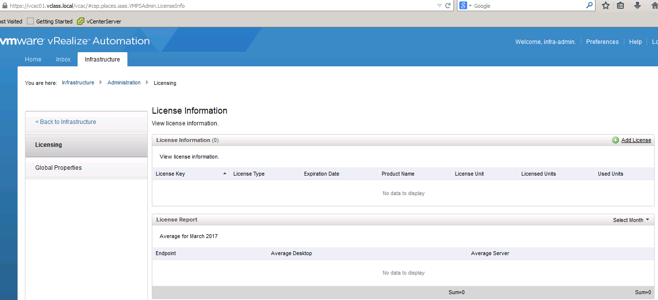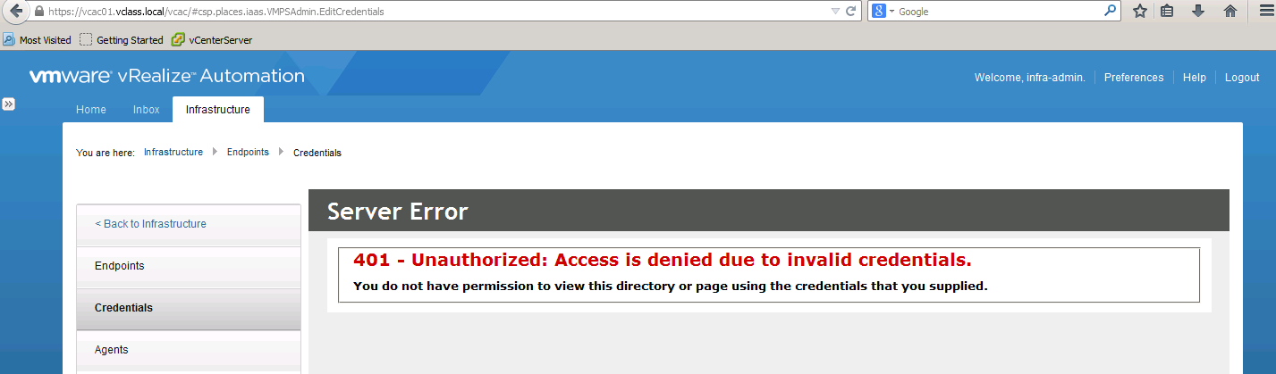 I was not able to access any options under Infrastructure Tab, though i logged in with infrastructure admin. For each option clicked, I was getting 401 – Unauthorized: Access Denied as in screenshot above.