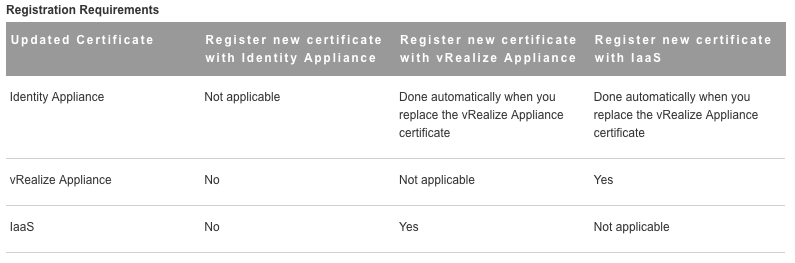 However, there is one exception is that an updated certificate for IaaS components must be registered with vRealize Appliance.