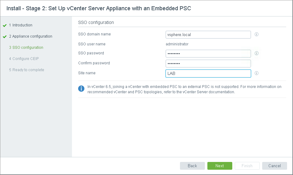 - Enter the SSO details such as SSO domain, SSO admin password and Site name and click next.