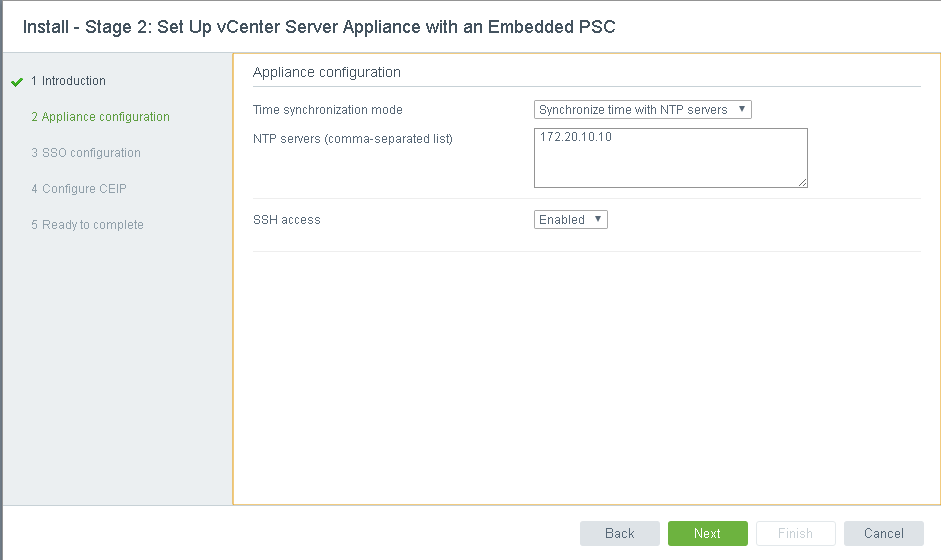 - Configure NTP settings and SSH access mode as per your requirement and click next. In this setup I have configured both as in screenshot below.