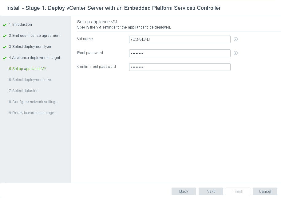- Provide vCenter Appliance details like appliance VM name in inventory, Root password and click next.