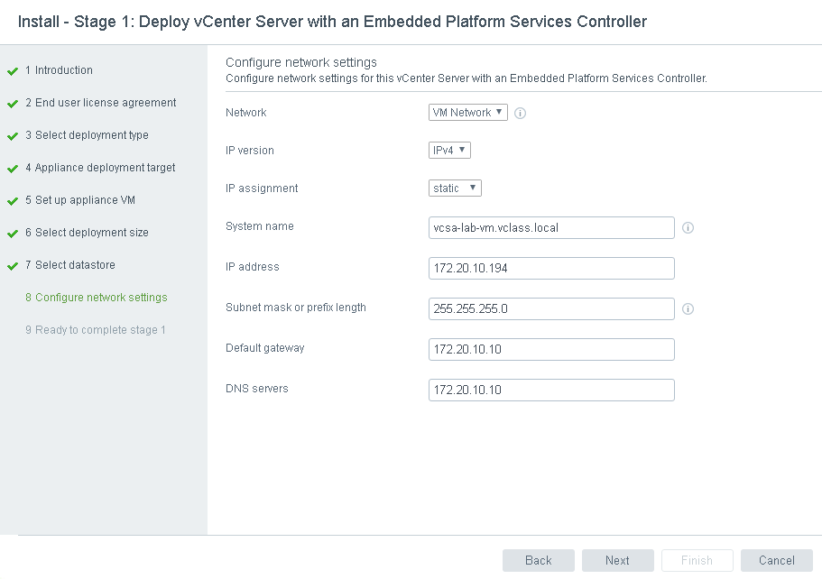 - Provide network details as per your environment design for vCenter Server appliance and click next.
