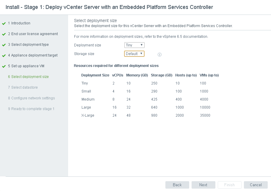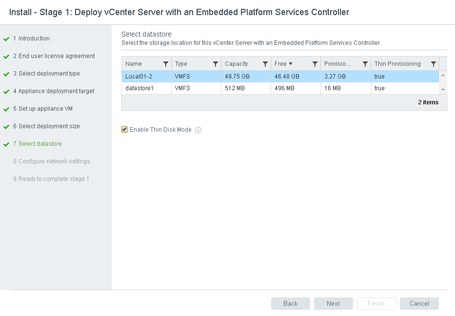 - Select the datastore for storing vCenter appliance VM files and click next. You can also use thin provisioning if required.