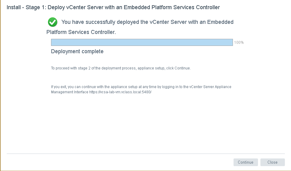 - Once deployment is completed, click continue to launch stage two of the installation.