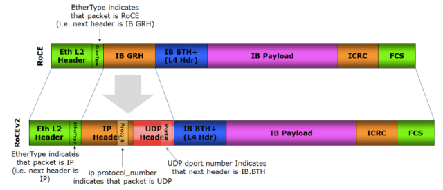The RoCEv2 protocol exists on top of either the UDP/IPv4 or the UDP/IPv6 protocol.[2] The UDP destination port number 4791 has been reserved for RoCE v2. Since RoCEv2 packets are routable the RoCE v2 protocol is sometimes called Routable RoCE or RRoCE.