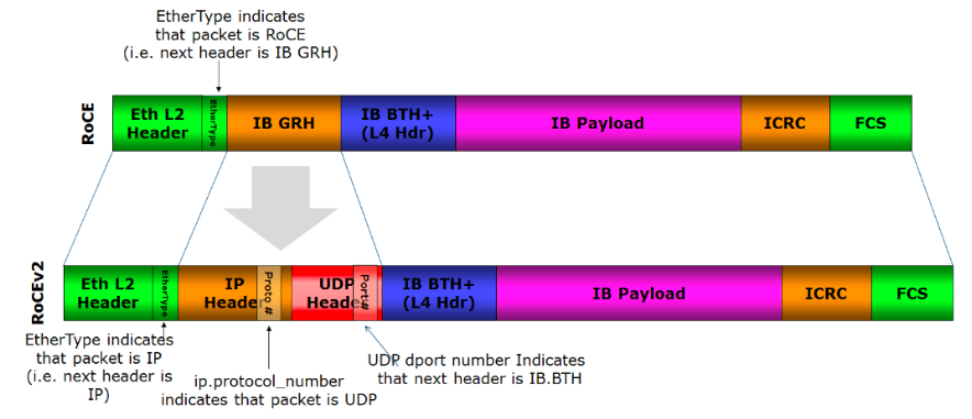 Following diagram shows the packet format for RoCEv1 and v2 protocols.