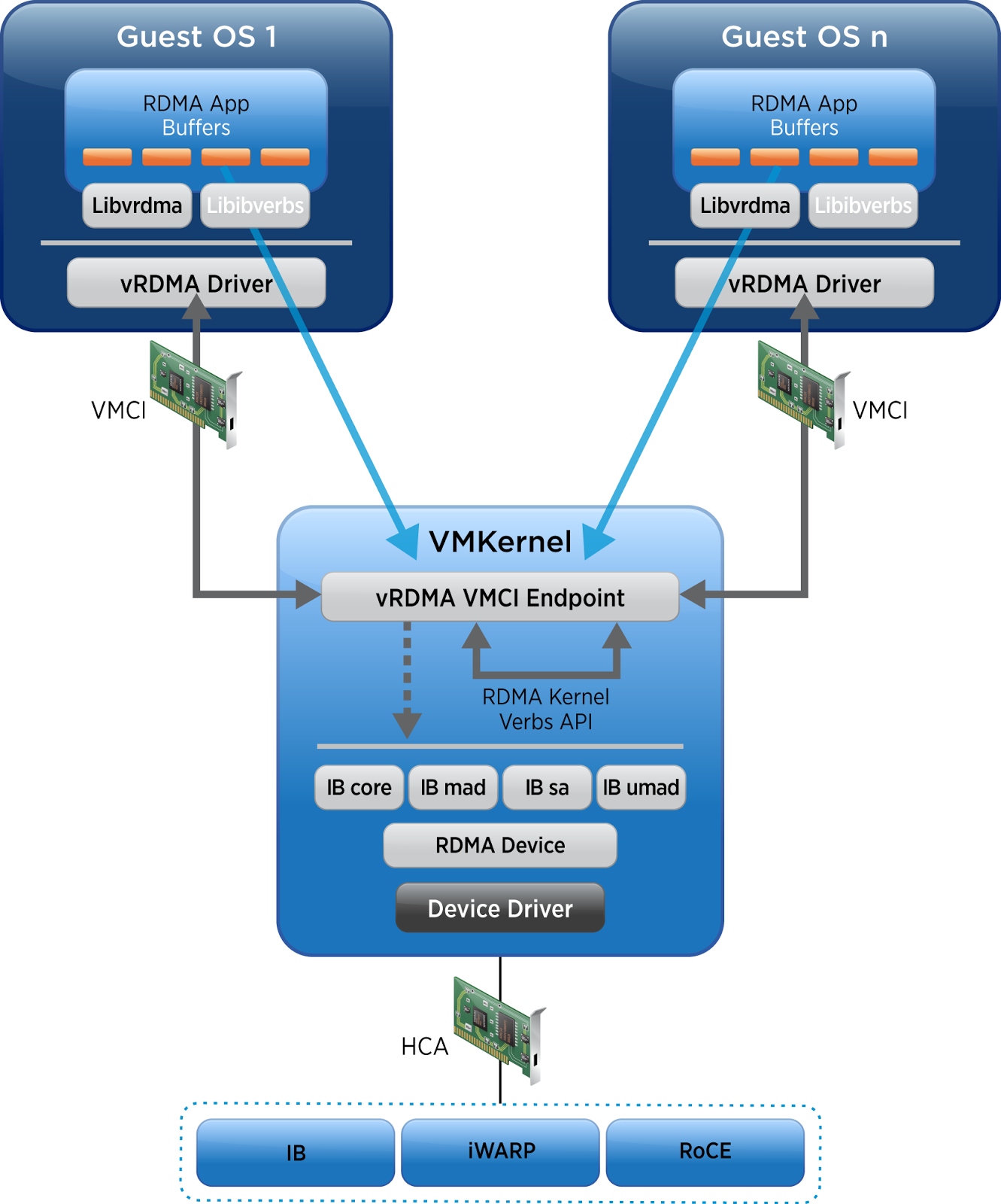 - For virtual machines on the same ESXi hosts or virtual machines using the TCP-based fallback, the HCA is not required (This point will be discussed later in this article).