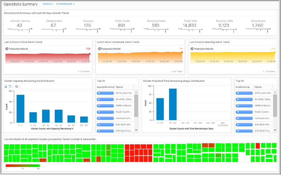 - Ability to provide summarized views of health and configuration of your Software Defined data center stack. This includes core applications such as VMware vCenter Server, VMware NSX, and VMware vSAN. The solution also covers the management applications such as vRealize Operations Manager, vRealize Log Insight, vRealize Automation, vRealize Business, and VMware Site Recovery Manager.