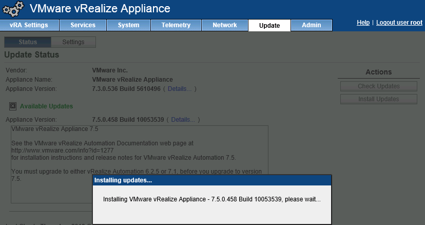- In order to intercept the background process, open another tab in your browser and connect to vRA VAMI with root credentials again. Then under updates, see the status