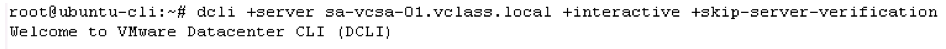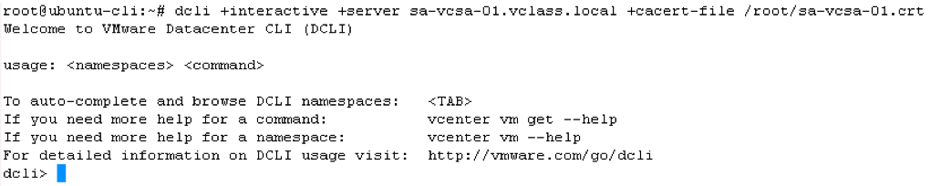 DCLI’s interactive shell has features, such as tab complete and session history retention and the ability to find a namespace just by starting it off with the first few characters.Below is the screenshot of logging in to DCLI from vCLI system with SSL.