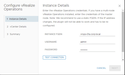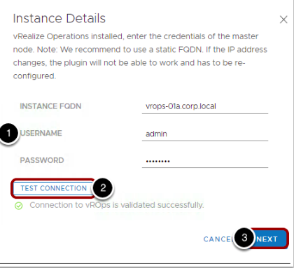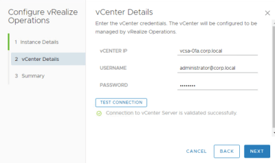 - Provide vCenter Server details and click Test connection as shown below. Click next once test connection is validated successfully.