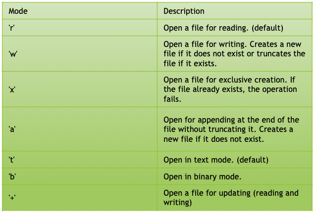 We can specify the mode while opening a file. In mode, we specify whether we want to read ‘r’, write ‘w’ or append ‘a’ to the file. We also specify if we want to open the file in text mode or binary mode.