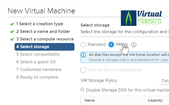 Using vPMEM, the memory is exposed to a guest OS as a virtual NVDIMM. This enables the guest OS to use PMEM in byte addressable random mode. VM must have hardware version 14 at least and also the guest OS that supports NVM technology. e.g. Windows Server 2016.