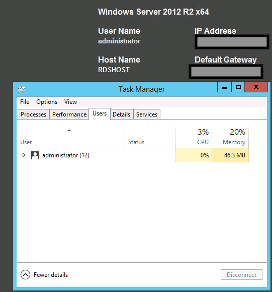 - Let’s check it further on RDS host now. Connect to your RDS server and open task manager on it and check the users tab as shown below. And here also we have another surprise. We have our user connected here as well