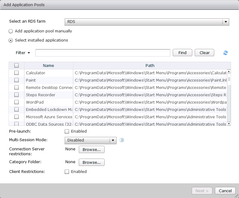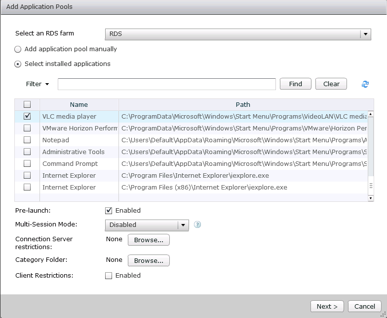 - Select the application that you want to publish from list or add manually and put a checkmark for prelaunch enabled as shown in below screenshot and click next. I will use VLC media player for this example.