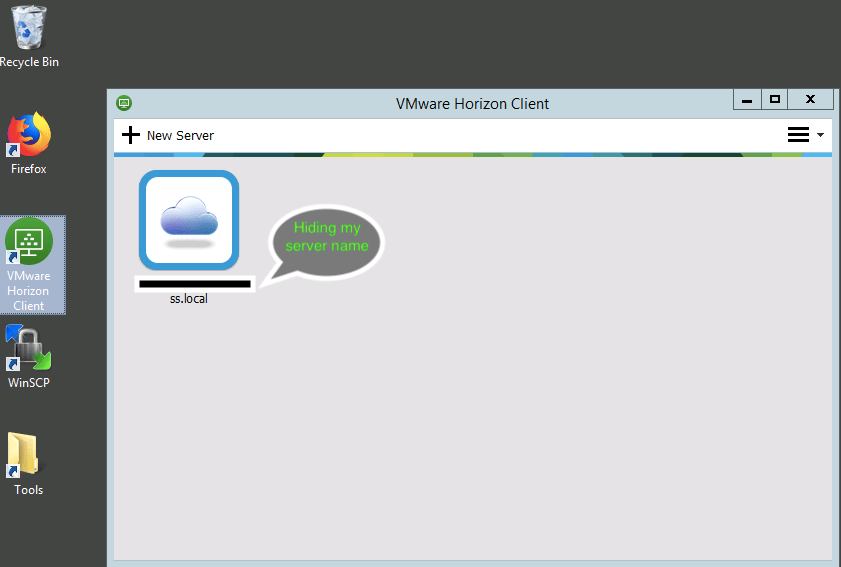 - Launch Horizon client by double clicking the desktop icon and double click to connect to your connection server if already added. Else, add connection server from top New Server link in horizon client window.