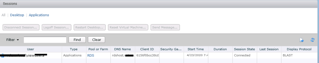- Once client is connected, let us check session monitoring details in Horizon admin console for any ongoing connection.