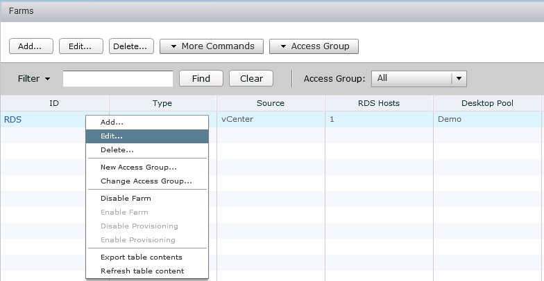 - Login to Horizon admin console and navigate to Farms under Resources as shown below.
