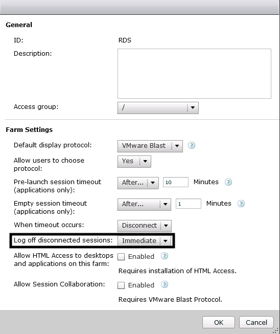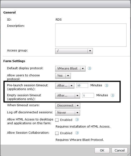 First of all we will setup RDS Farm settings and an application pool in Horizon with session pre-launch option set to enabled. By the way, I am using Horizon 7.7 in my test lab.