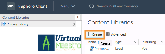 - Login to vSphere client and navigate to content libraries from Menu option from top. As you can see in below screenshot, we have our Primary content library with a template that we added earlier.