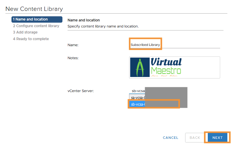 - On new library wizard, assign the name to library and associate it with vCenter server from remote site, then click Next.