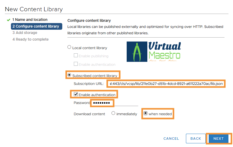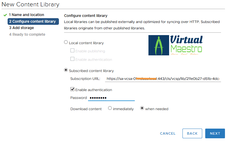 - On configure library page, select as subscribed content library this time and then paste the URL that we copied earlier. Also, put check on enable authentication and type the password that we used while creating primary library to password protected it. Also select the download option and click Next. I will talk about replicating data to remote site later in this post.