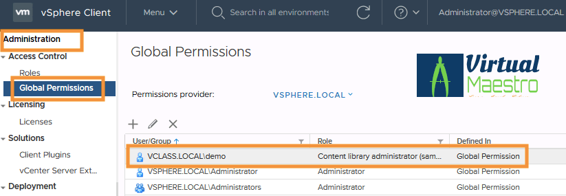For demo purpose I have used content library administrator (sample) role, in production environment it is recommended not to use any sample roles directly as they can be used as templates for future custom role creations. Instead, copy the sample role and create custom role and then assign it to the user.