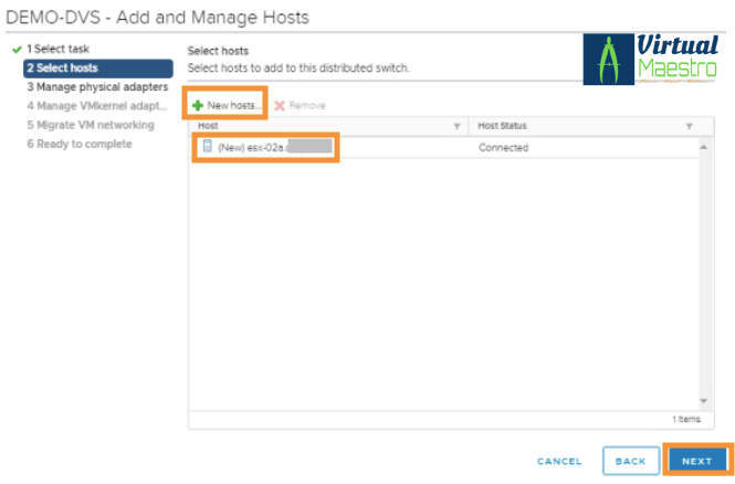 - Click + sign to add new host to DVS, select host and click next. For this demo I am just adding one ESXi.