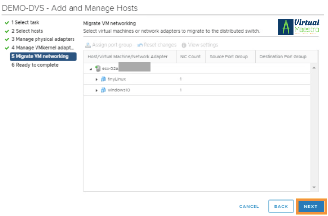 - As of now, we don’t want to migrate any VMs to DVS, so click next. We can do this at later time as required.