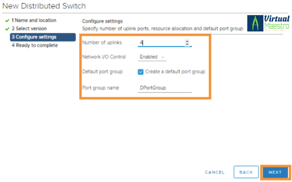 - Edit no of uplinks as required, enable or disable NIOC as required, and you can continue creation of default portgroup along with switch creation or uncheck if you want to do it later. Click next.