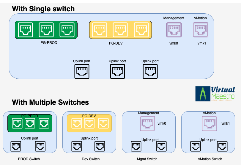 But, we may have to create multiple switches in certain cases such as you don’t want to use VLANs in virtual networks, basically physical segregation of traffic as in image above in second half.