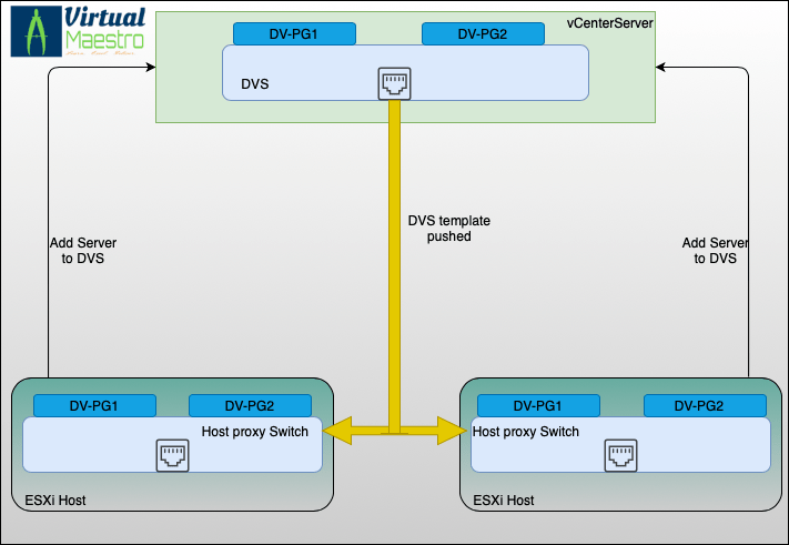 If you see, what is on vCenter Server, only DVS Layout of how the switch is designed i.e. port groups, no of uplink. For ESXi host to use DVS, we need to add it as member of DVS. Once we add all our ESXi hosts to DVS, similar layout is used to create DVS on ESXi host automatically. This DVS instance on ESXi host is called as Host proxy switch. So actual switch functionality i.e. traffic is still on ESXi only, its just that it is linked to template we created as DVS in vCenter server for centralized management. So in future whenever you have to add new components or make changes to existing components in DVS, simply make change to template of DVS in vCenter Server and it gets propagated to all ESXi hosts that are connected to DVS. That is how DVS centralized management works.
