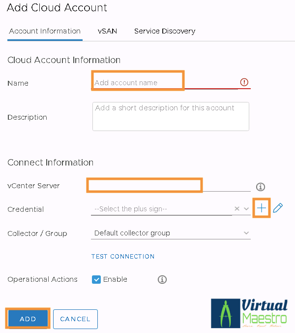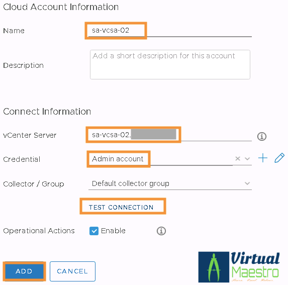 Put check mark on Enable in front of Operational Access, this will allow vCenter Python Actions adapter to modify objects on this target vCenter Server. Credentials will be required for vCenter Python actions adapter as well. Finally, click Add to complete cloud account setup.