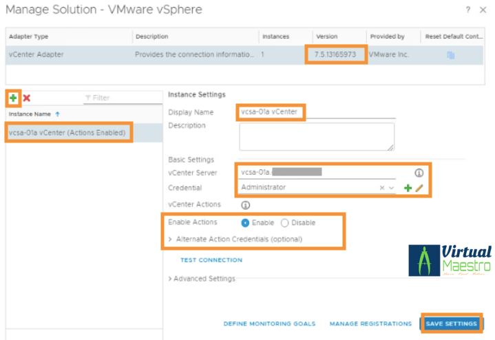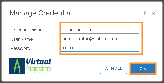 On the next screen, provide details such as Name and target vCenter Server and click + symbol to add credentials for connecting vCenter Server instance.
