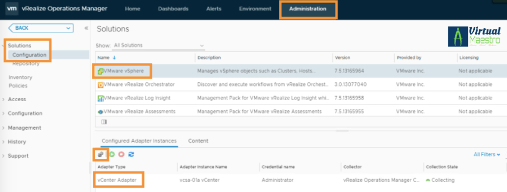 In previous versions such as vROPS 7.5, we could configure vSphere Solution from Administration page.