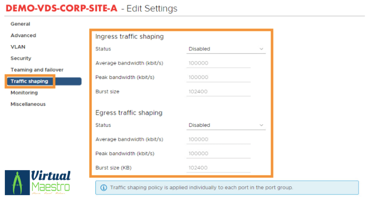 As you can see in above images, there is only Egress or outbound traffic shaping configuration options available in standard switches, whereas DVS allows both Egress as well as Ingress.