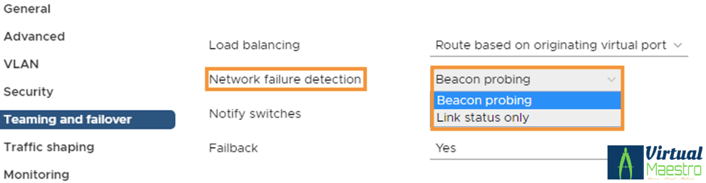 Beacon probing is more reliable method of network failure detection compared to Link status only and highly recommended for use. However, you need to satisfy minimum requirement of three uplinks and odd number of uplinks if more than three.