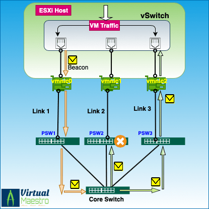 Each uplink (in this case vmnic0) sends out a packet as Ethernet broadcast frames. Beacon probing uses this packet information along with link status to determine link failure. As remaining uplinks (vmnic1 and vmnic2 here) receives the beacon sent by an uplink, each remaining uplink comes to know that it is not isolated from the others and link state is also fine (Up). Beacon probing process has advantage that it can detect upstream failures as well as it can detect some misconfigurations unlike link status only.